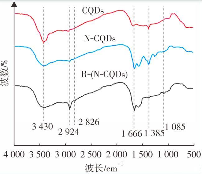 圖2是CQDs、N-CQDs與R-(N-CQDs)的紅外吸收光譜,在3 430 cm-1處的吸收峰是O-H和N-H伸縮振動(dòng),相比于N-CQDs,R-(N-CQDs)在此處的吸收峰較弱,說(shuō)明在N-CQDs基礎(chǔ)上發(fā)生了一定程度的烷基化反應(yīng),而CQDs在此處的峰比N-CQDs與R-(N-CQDs)的峰要窄,因?yàn)镃QDs上只存在O-H的伸縮振動(dòng),在2 924 cm-1和2 824 cm-1處的吸收峰是C-H的伸縮振動(dòng),R-(N-CQDs)在此處的吸收峰比N-CQDs的要強(qiáng)。1 660 cm-1處的吸收峰對(duì)應(yīng)于酰胺基團(tuán)C=O鍵的拉伸振動(dòng),1 385 cm-1處的峰為C-O伸縮振動(dòng),1 085 cm-1處的峰為胺類烷基的C-N振動(dòng),R-(N-CQDs)在此處的峰較N-CQDs更為明顯,而CQDs在此處看不到任何吸收峰,進(jìn)一步說(shuō)明在R-(N-CQDs)在N-CQDs的基礎(chǔ)上完成烷基化改性成功引入碳長(zhǎng)鏈。圖2表明實(shí)現(xiàn)了將氮原子摻雜到碳量子點(diǎn)中的目標(biāo),并且在此基礎(chǔ)上引入了碳長(zhǎng)鏈對(duì)其進(jìn)行表面修飾。