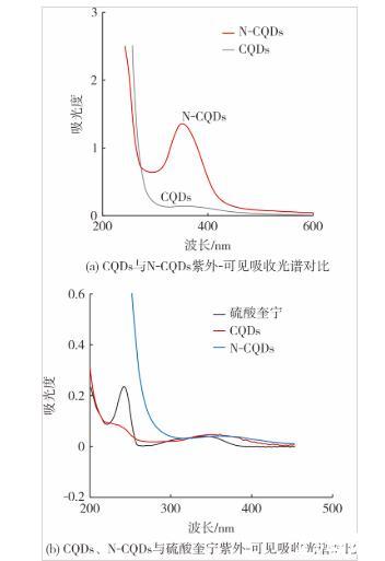 圖4(a)是CQDs與N-CQDs的紫外-可見吸收光譜。與CQDs的吸收光譜相比,N-CQDs在波長(zhǎng)為350 nm處有一個(gè)明顯的吸收峰,這是酰胺基團(tuán)中的C=O的n→π躍遷所致,在長(zhǎng)波段方向出現(xiàn)吸收帶。這也表明氮原子已被成功引入碳量子點(diǎn)中。圖4(b)是以參比法計(jì)算熒光量子產(chǎn)率CQDs和N-CQDs以及硫酸奎寧的紫外吸收光譜對(duì)比,從圖4(b)可以看出,三者吸光度在波長(zhǎng)為300~400 nm區(qū)間內(nèi)基本接近,且數(shù)值上沒有超過(guò)0.05,滿足量子產(chǎn)率計(jì)算條件要求,可以此濃度為基礎(chǔ)計(jì)算熒光量子產(chǎn)率。
